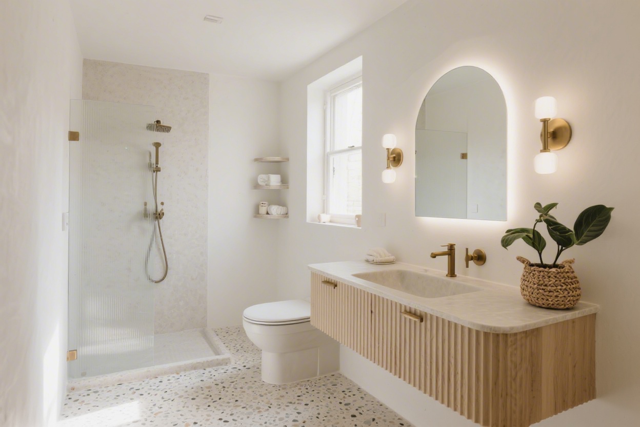 - Layer three lighting types: task (mirror), ambient (ceiling), and accent (under-vanity or niche).